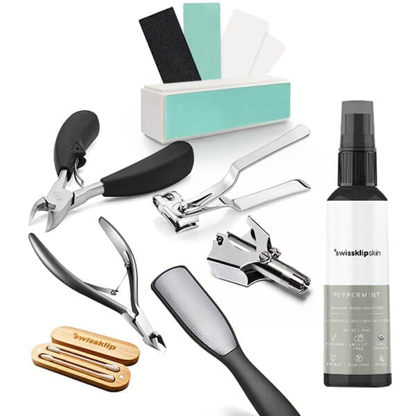 1x Swissklip 360, 1x Swissklip Heavy Duty, 1x Swissklip Cuticle Cutter, 1x Swissklip Nail Buffer, 1x Replacement pads, 1x Callus Remover, 1x Nose Hair Trimmer, 1x Reusable Swab
