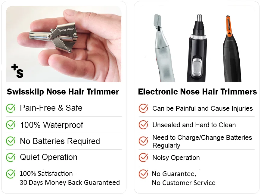 The Swissklip Nose Hair Trimmer is engineered to provides the most efficient trimming experience, with surgical-grade blades, WITHOUT any risk. It is the safest and more effective device compared to other types of electric shavers.