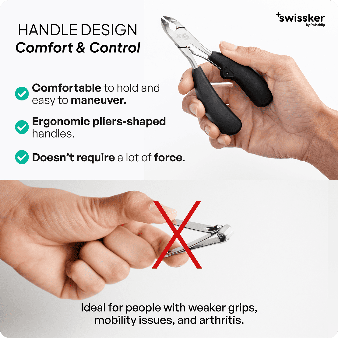 The Swissklip Heavy Duty toenail clipper features our exclusive Forever Sharp Blades, combining a long, big non-slip handle and double sharpened blades for effortless and precise nail clipping, even on thick and ingrown nails.