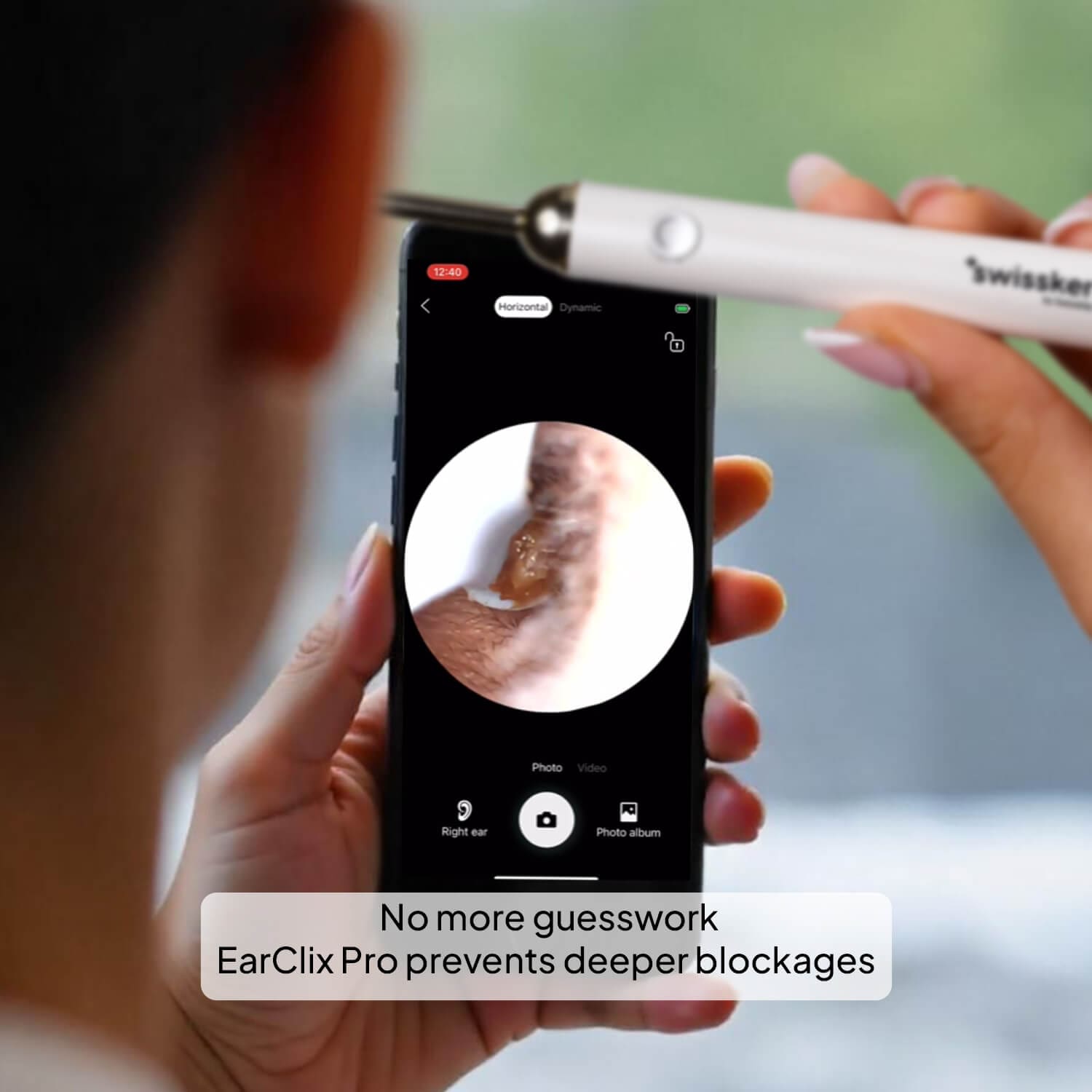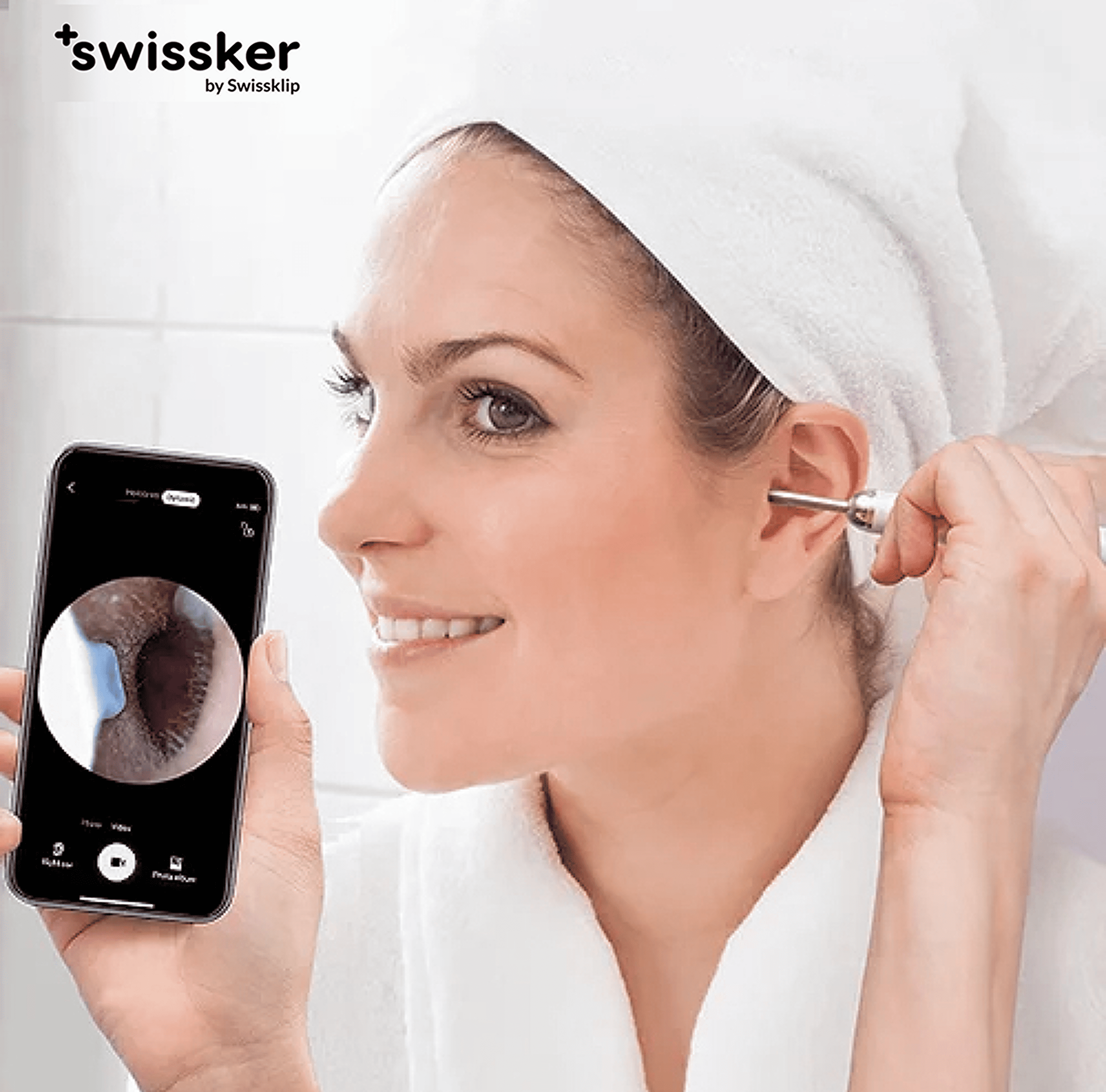 Woman using EarClix Pro ear wax camera tool, holding a phone displaying the view inside her ear, showcasing the device's functionality.
