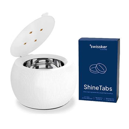 The ShinePod is an ultrasonic denture and retainer cleaner that uses UV light to kill bad breath germs. Also works as an effective mouth guard cleaner.