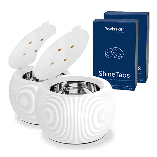 The ShinePod is an ultrasonic denture and retainer cleaner that uses UV light to kill bad breath germs. Also works as an effective mouth guard cleaner.