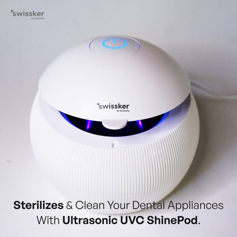 ShinePod is an ultrasonic retainer cleaner that uses a 42k hz vibration and UVC light to remove debris and kill up to 99.9% of germs and bacteria. Fill the ShinePod with clean water, add your dental appliance, close the lid, press the power button and let it work. It’ll automatically turn off after 5 minutes.