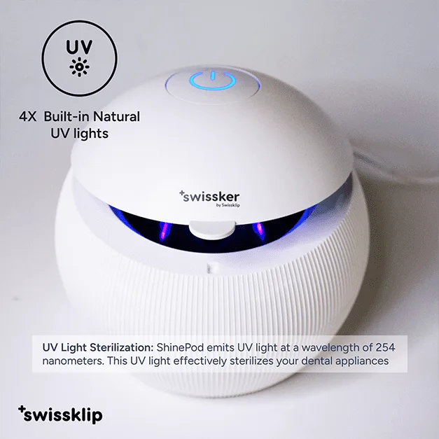 Simultaneously, ShinePod emits UV light at a wavelength of 254 nanometers. This UV light effectively sterilizes your dental appliances, eliminating harmful bacteria, viruses, and fungi on the surface with the same sterilization technology used by hospital and airlines.